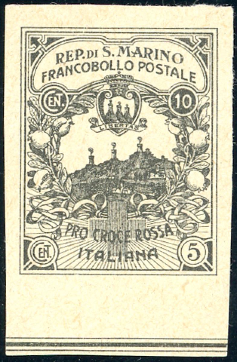 1916 - 10 + 5 cent. Croce Rossa, prova di stampa in nero, non dentellata (CEI P50A € 1.250), bordo di foglio, senza gomma come sempre, ... Read more