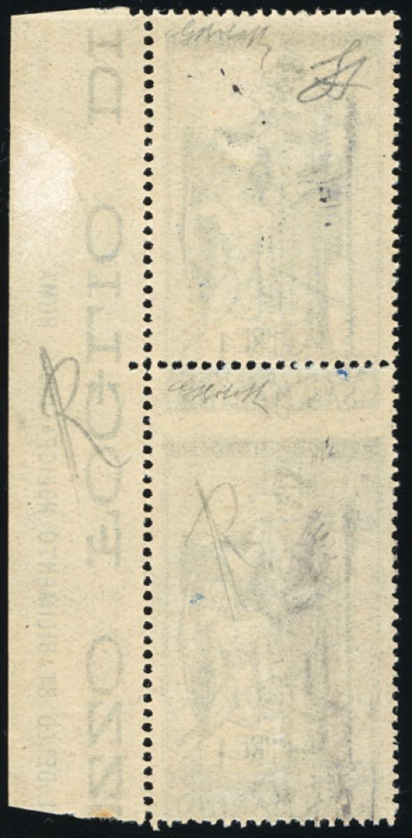 1924 - 1 lira Garibaldi, coppia verticale, dentellatura centrale fortemente spostata in alto (101ec), bordo di foglio, gomma originale ... Read more