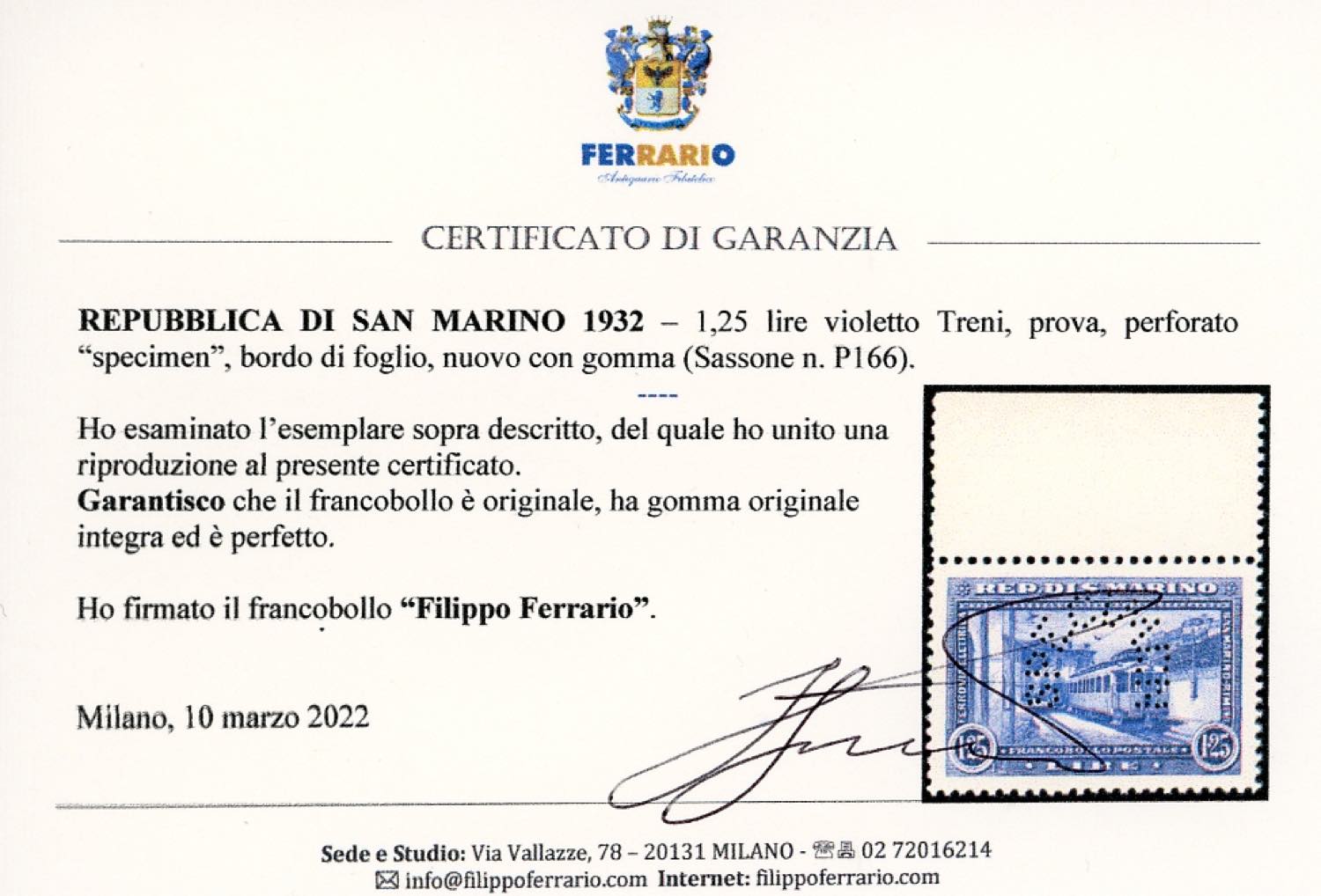 1932 - 1,25 lire violetto Treni, perforato "specimen" (P166), bordo di foglio, gomma originale integra, perfetto. Splendido. Cert. Ferrario.