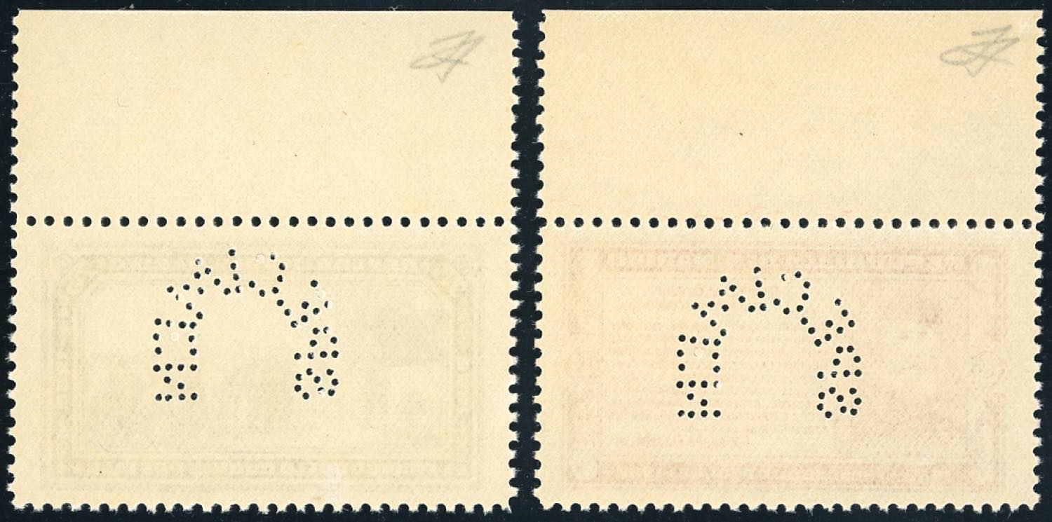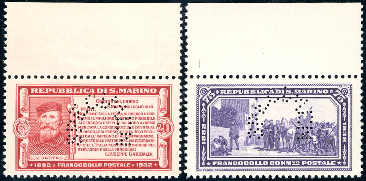 1932 - 20 cent. carminio e 75 cent. violetto Garibaldi, perforati "specimen" (P169,P172), bordo di foglio, gomma originale integra, ... Read more