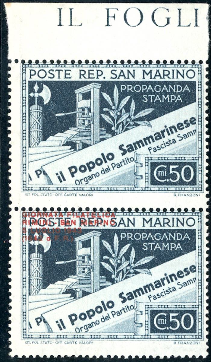 1943 - 50 cent. Giornata Filatelica, coppia verticale, un esemplare senza la soprastampa (239a), bordo di foglio, gomma originale integra, ... Read more
