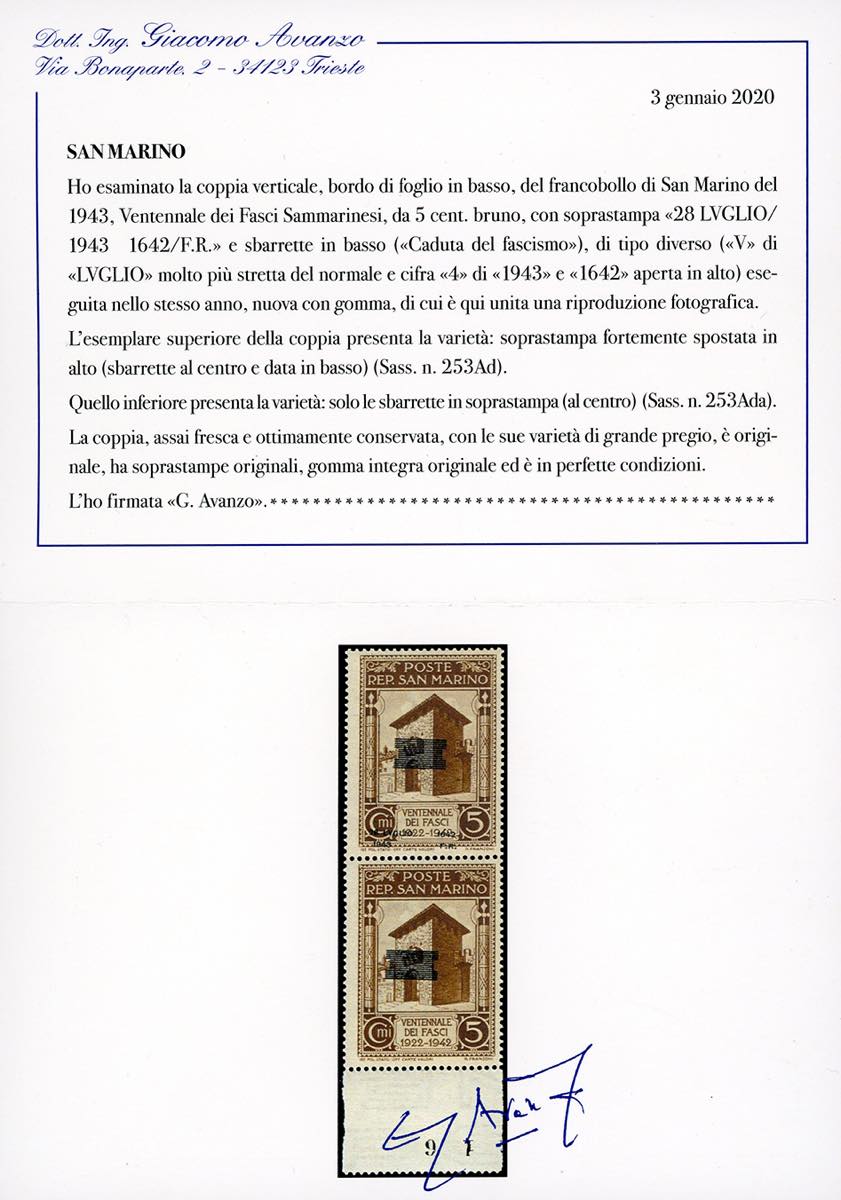 1943 - 5 cent. Caduta del fascismo, soprastampa di tipo diverso, coppia verticale, un esemplare con soprastampa fortemente spostata in alto, l'altro con solo sbarrette in soprastampa (253Ad,253Ada), bordo di foglio, gomma originale integra, perfetta. Molto rara! Cert. E.Diena e Avanzo.
