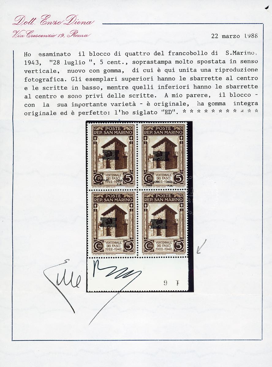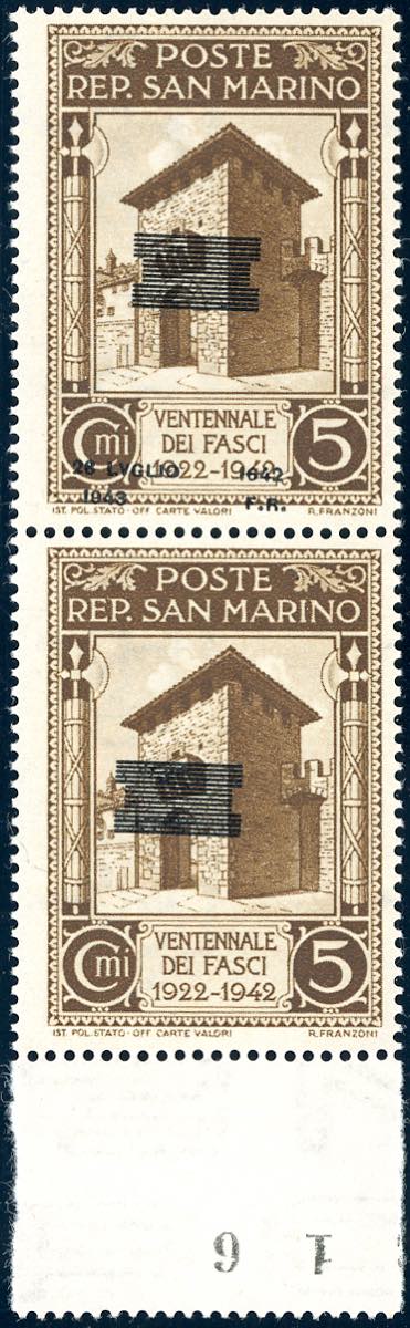 1943 - 5 cent. Caduta del fascismo, soprastampa di tipo diverso, coppia verticale, un esemplare con soprastampa fortemente spostata in ... Read more