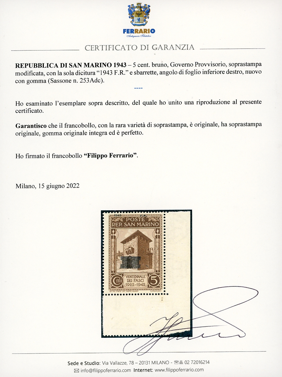 1943 - 5 lire Governo Provvisorio, soprastampa di tipo diverso, solo "1943 F.R." e sbarrette in soprastampa (253Adc), angolo di foglio, gomma originale integra, perfetto. Cert. Ferrario.