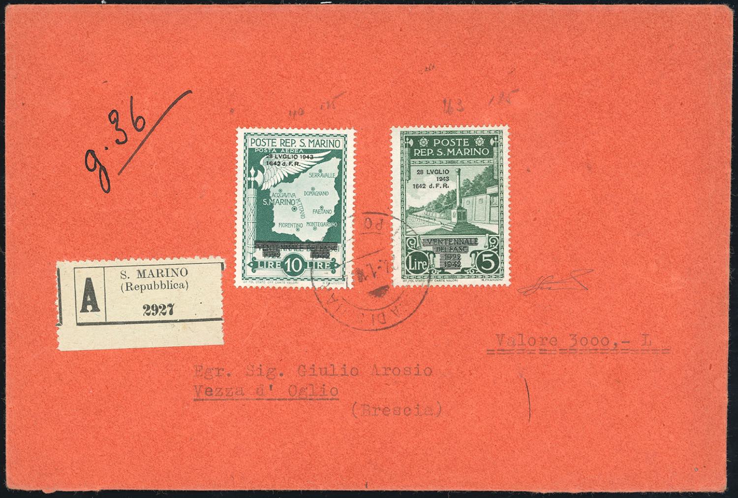 1944 - 5 lire, 10 lire di posta aerea Caduta del Fascismo (263,A40), perfetti, su busta assicurata per 3.000 lire da San Marino 24/1/1944 a ... Read more
