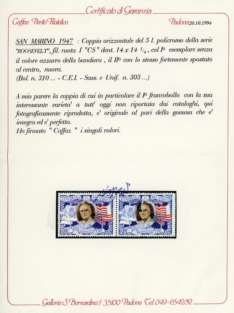 1947 - 5 lire Roosvelt, coppia orizzontale, il primo esemplare senza la stampa dell'azzurro della bandiera, il secondo con la stampa dell'azzurro fortemente spostata (303kc,303kb), gomma integra, perfetta. Molto rara, pochi esemplari noti. Cert. Caffaz.