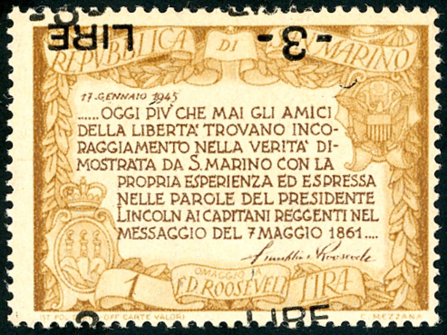 1947 - 3 lire su 1 lira Roosvelt, doppia soprastampa di cui una capovolta (307c), gomma integra, perfetto. Molto rara, SOLO 6 ESEMPLARI NOTI. E.Diena, Ferrario, cert. Raybaudi.