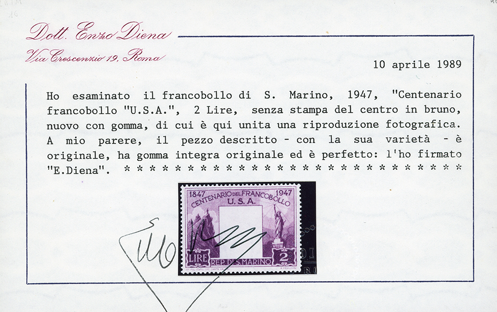 1947 - 2 lire Centenario francobollo Stati Uniti, senza la stampa del centro (330h), gomma originale integra, perfetto. Splendida e rara viarietà. Sorani, cert. E.Diena.