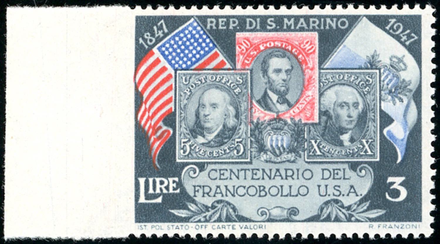Lot 1412 - 1947 - 3 lire Centenario francobollo Stati Uniti, dent. 14 ...