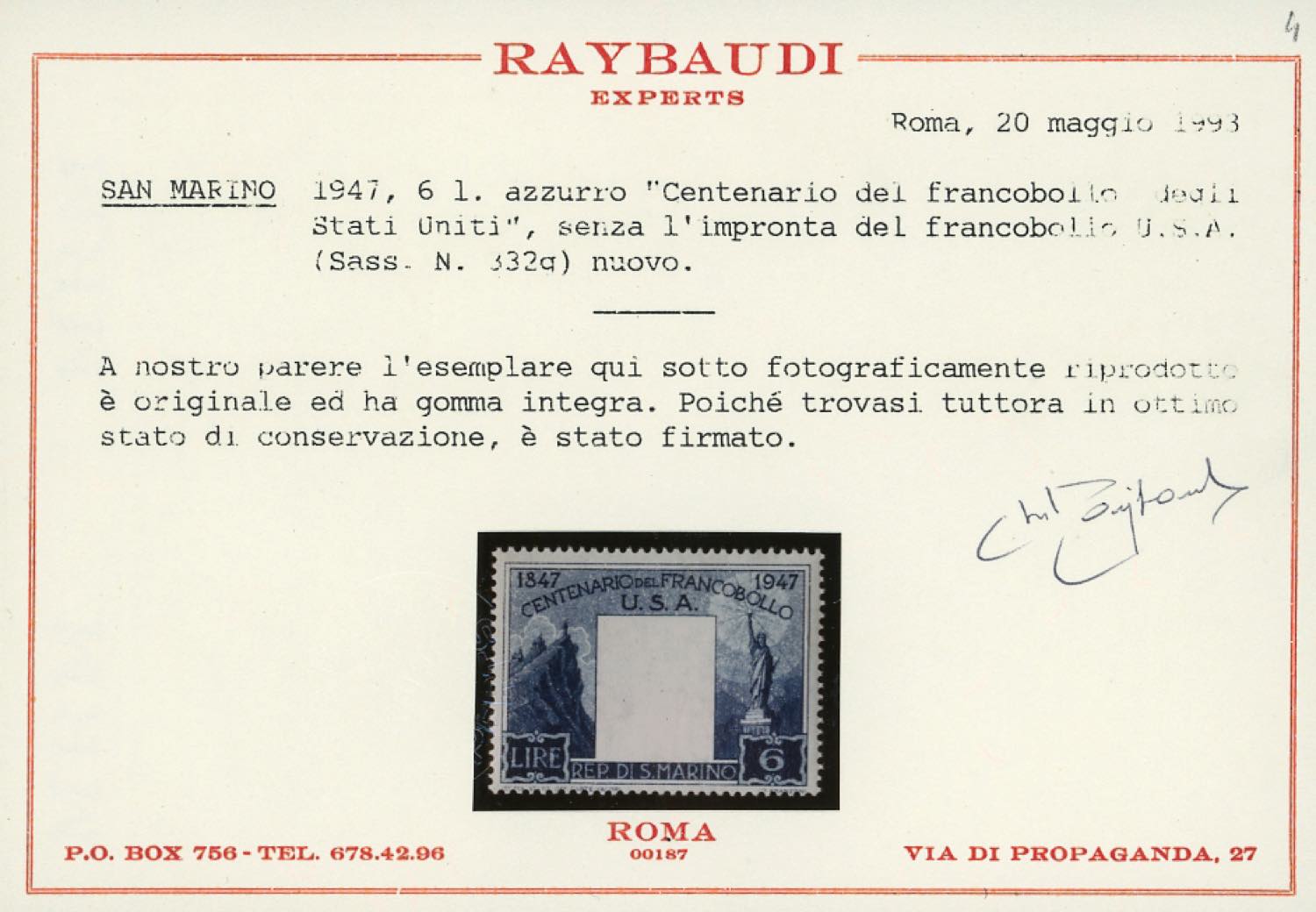 Lot 1415 - 1947 - 6 lire Centenario francobollo Stati Uniti, senza la ...