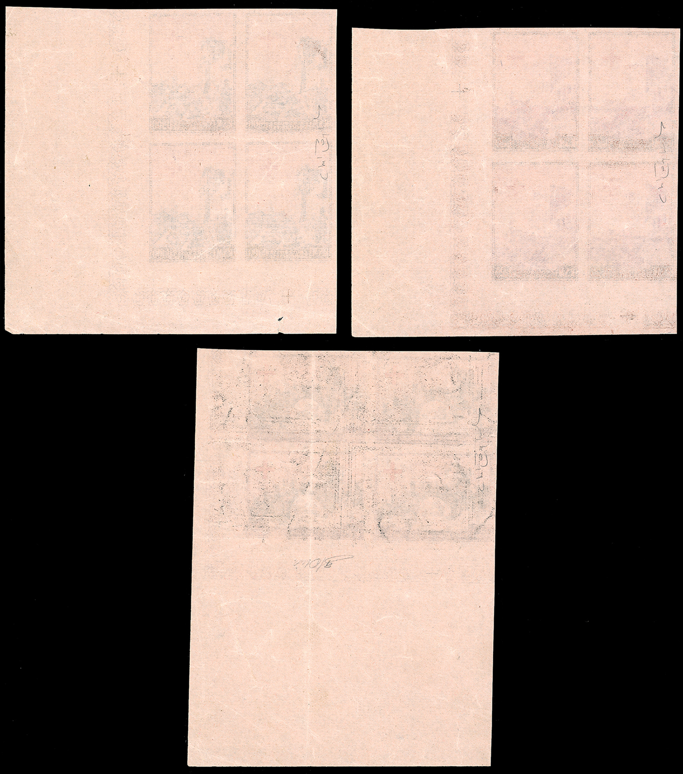 1951 - Croce Rossa, serie completa (369/371), prove di macchina su carta sottile rosa, senza filigrana, non dentellata e senza gomma, blocchi di quattro, angolo di foglio, perfetti. Rari! Cert. Raybaudi.