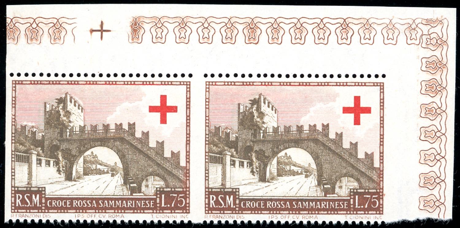 1951 - 75 lire Croce Rossa (370), non dentellato verticalmente, coppia angolo di foglio, gomma originale integra, perfetta. Bella varietà, ... Read more