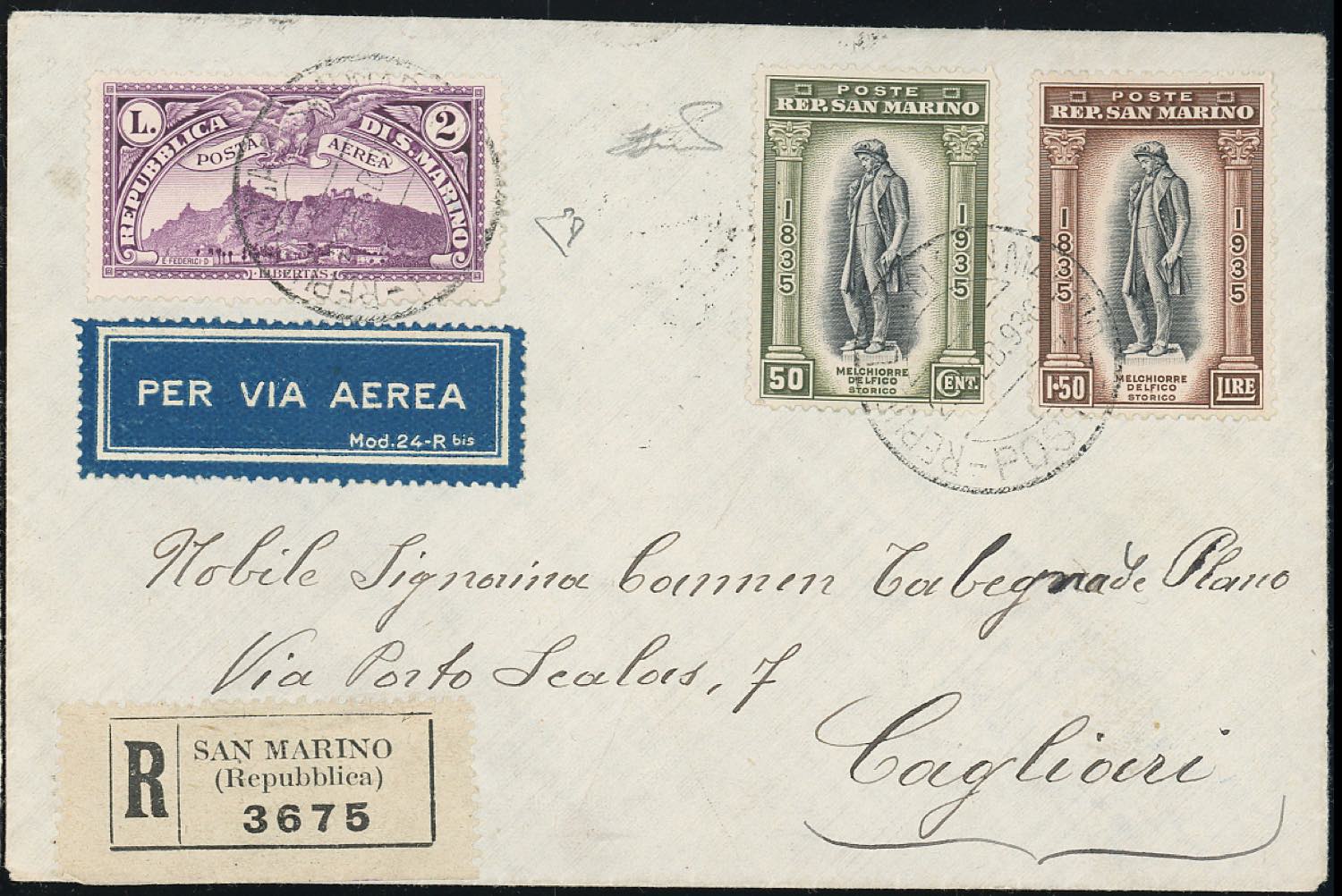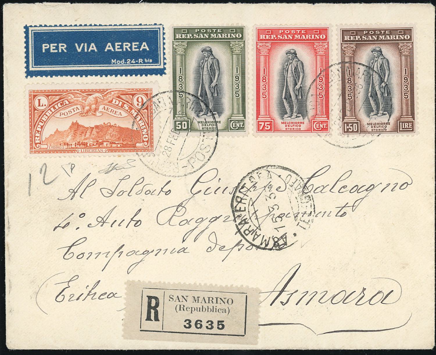 1936 - Veduta, serie completa (1/10), con complementari della serie Delfico, perfetti, su otto aerogrammi, sei dei quali raccomandati, spediti da San Marino nel febbraio/marzo 1936 ad Asmara o a Cagliari. Raro insieme. Ferrario, cert. E.Diena.