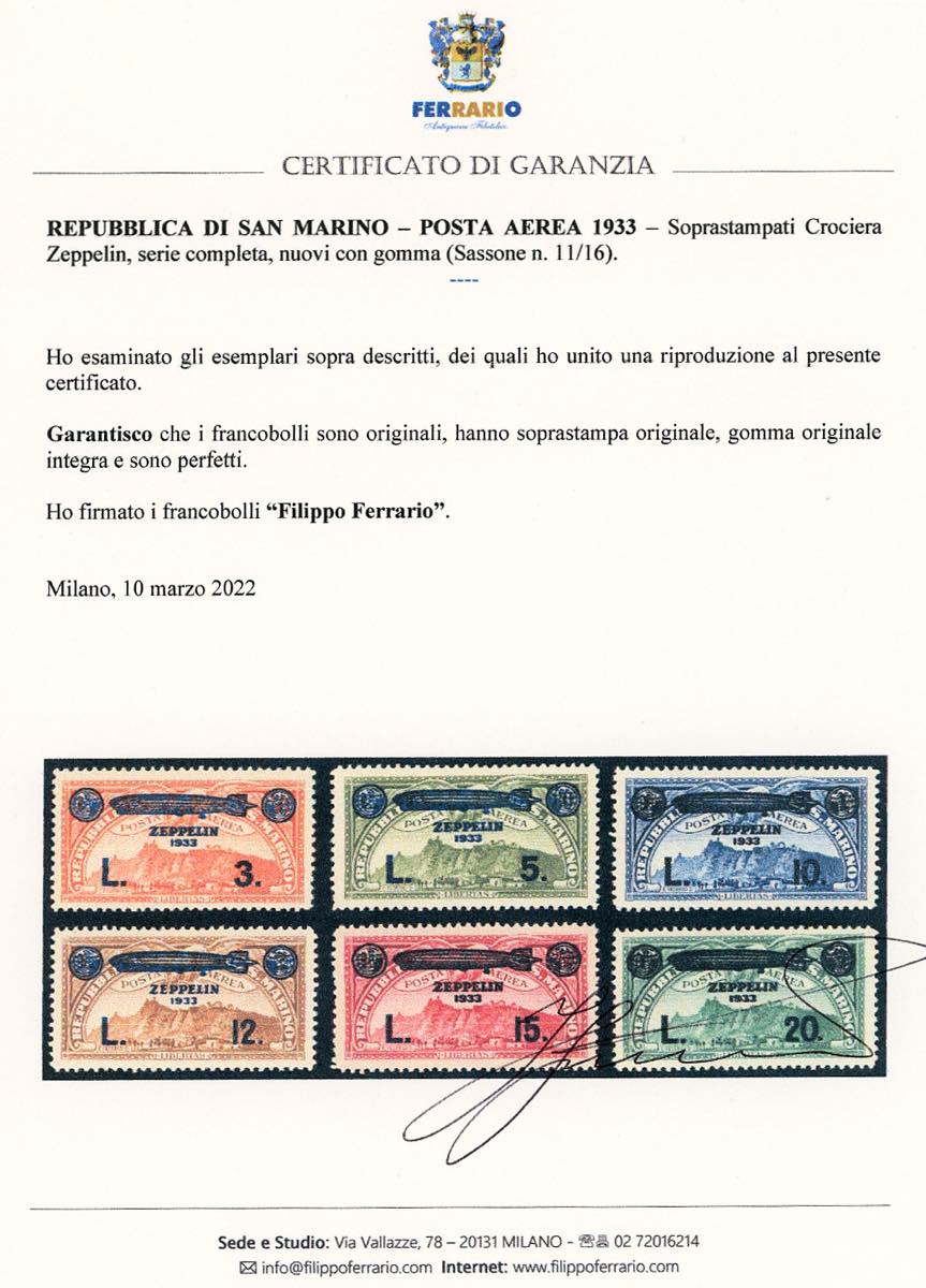 1933 - Zeppelin, serie completa (11/16), gomma originale integra, perfetta. Cert. Ferrario.