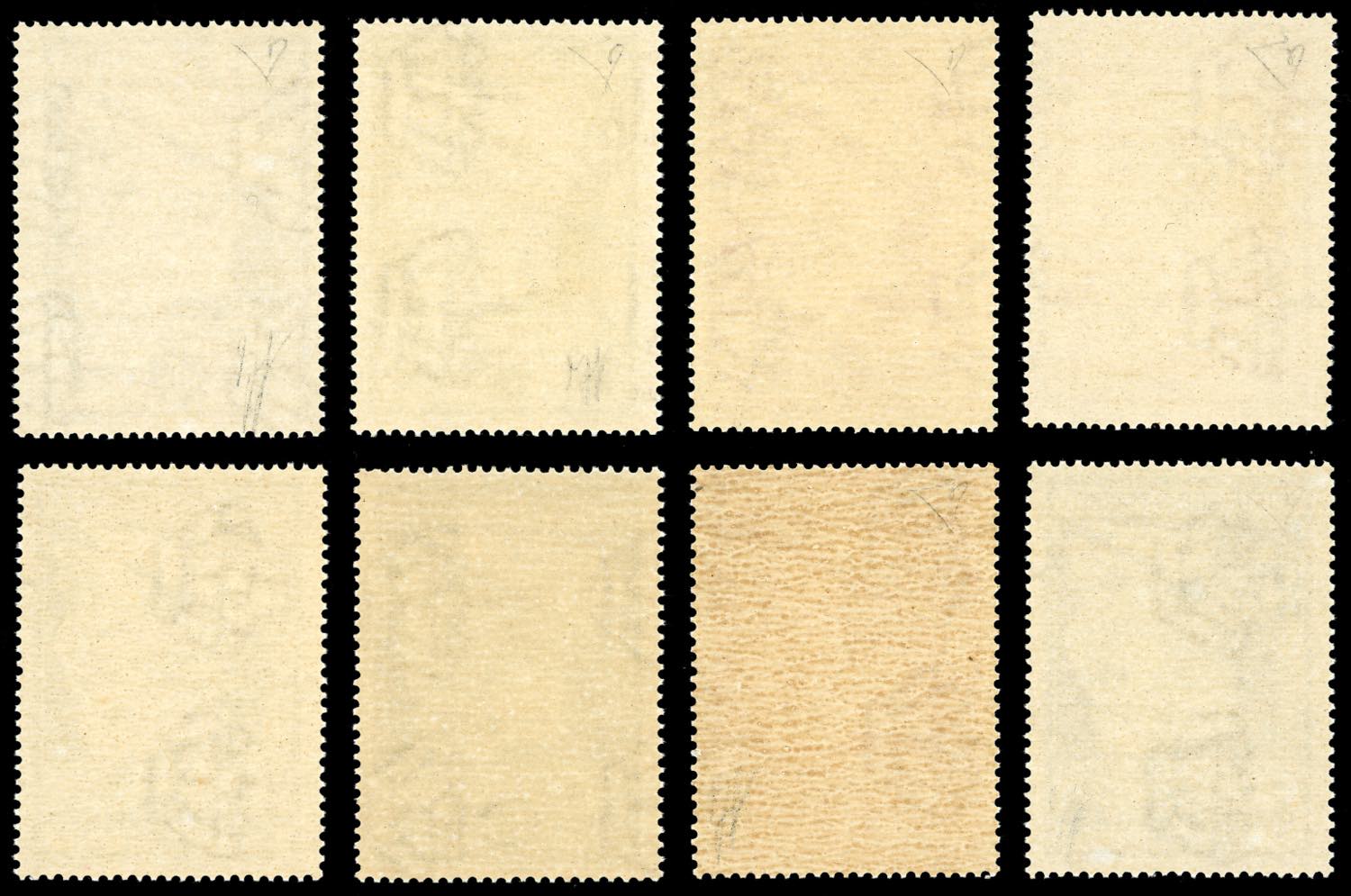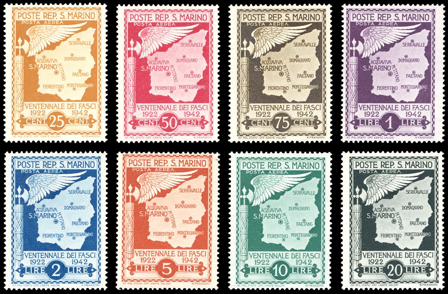1943 - Ventennale dei Fasci, non emessi, serie completa (26/33), ben centrati, gomma originale integra, perfetti. Molto belli. Cert. E.Diena e Ferrario.