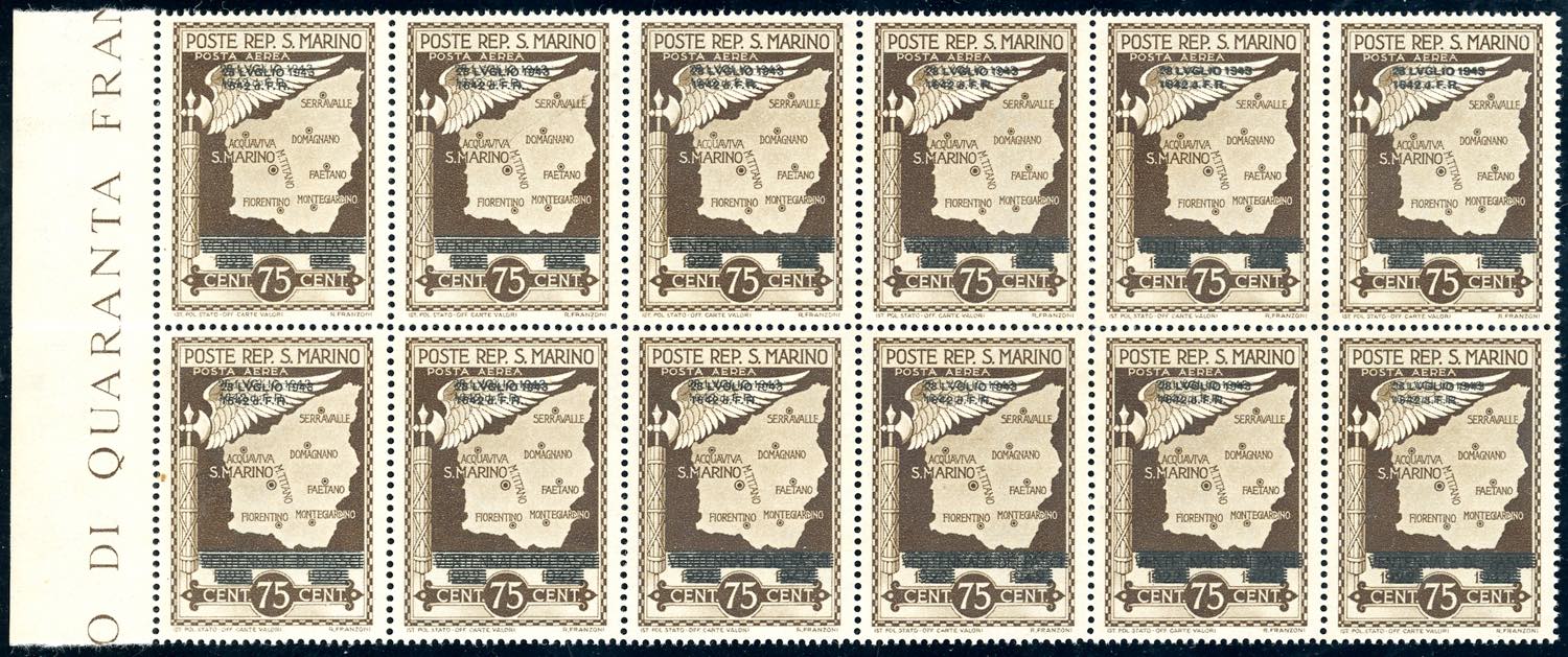 1945 - 75 cent. Caduta del Fascismo, blocco di dodici esemplari, sei con doppia soprastampa completa, sei con doppia soprastampa delle sole ... Read more