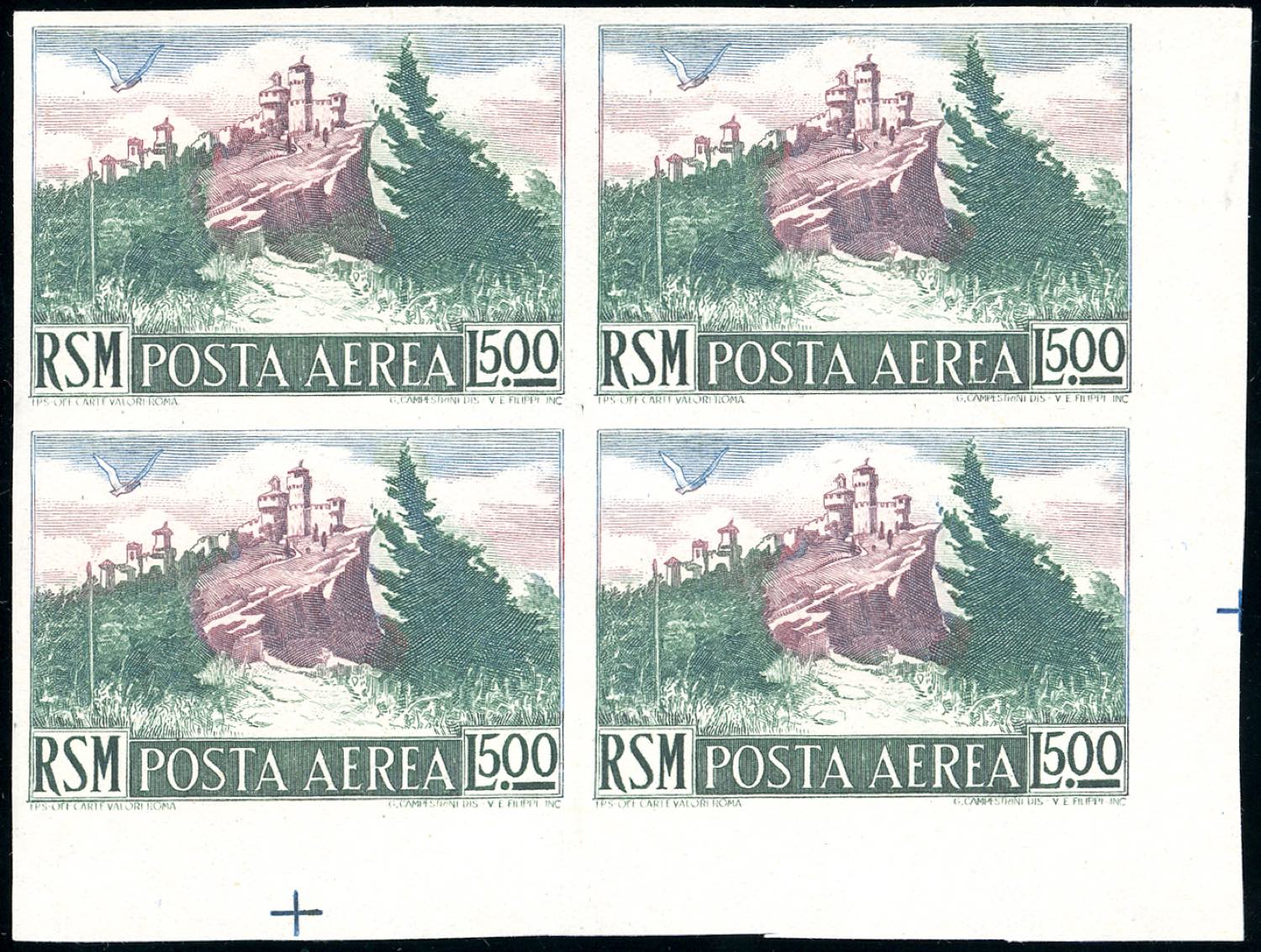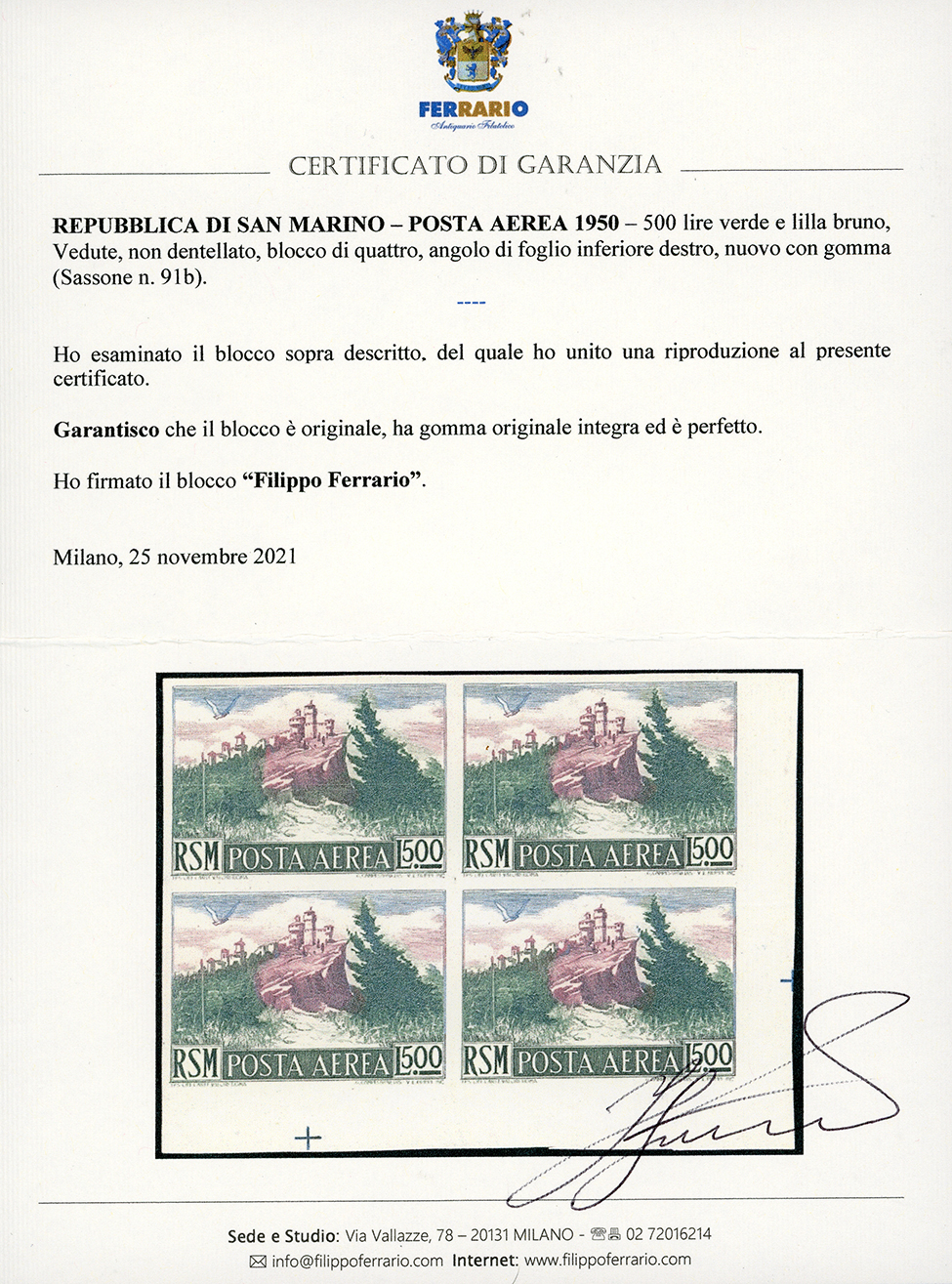 1950 - 500 lire Vedute, non dentellato (91b), blocco di quattro, angolo di foglio, gomma originale integra, perfetto. Bello e raro. Cert. Ferrario.