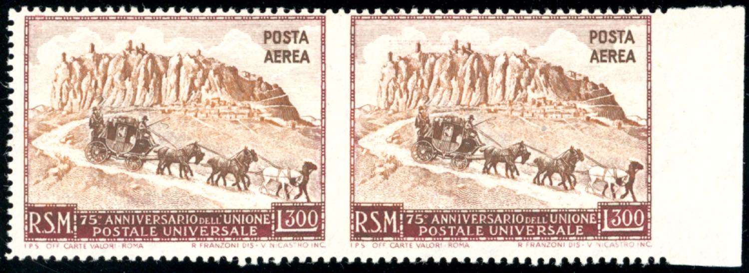 1951 - 300 lire UPU, coppia orizzontale, non dentellata al centro e a destra (95ea), bordo di foglio, gomma originale integra, perfetta. ... Read more