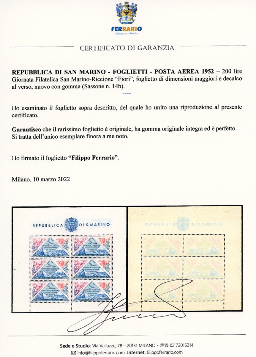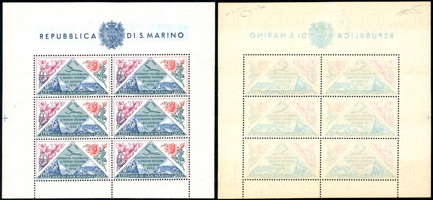 1952 - 200 lire Giornata Filatelica - Fiori, foglietto di dimensioni maggiori con decalco completo al verso (14b), gomma originale integra, ... Read more
