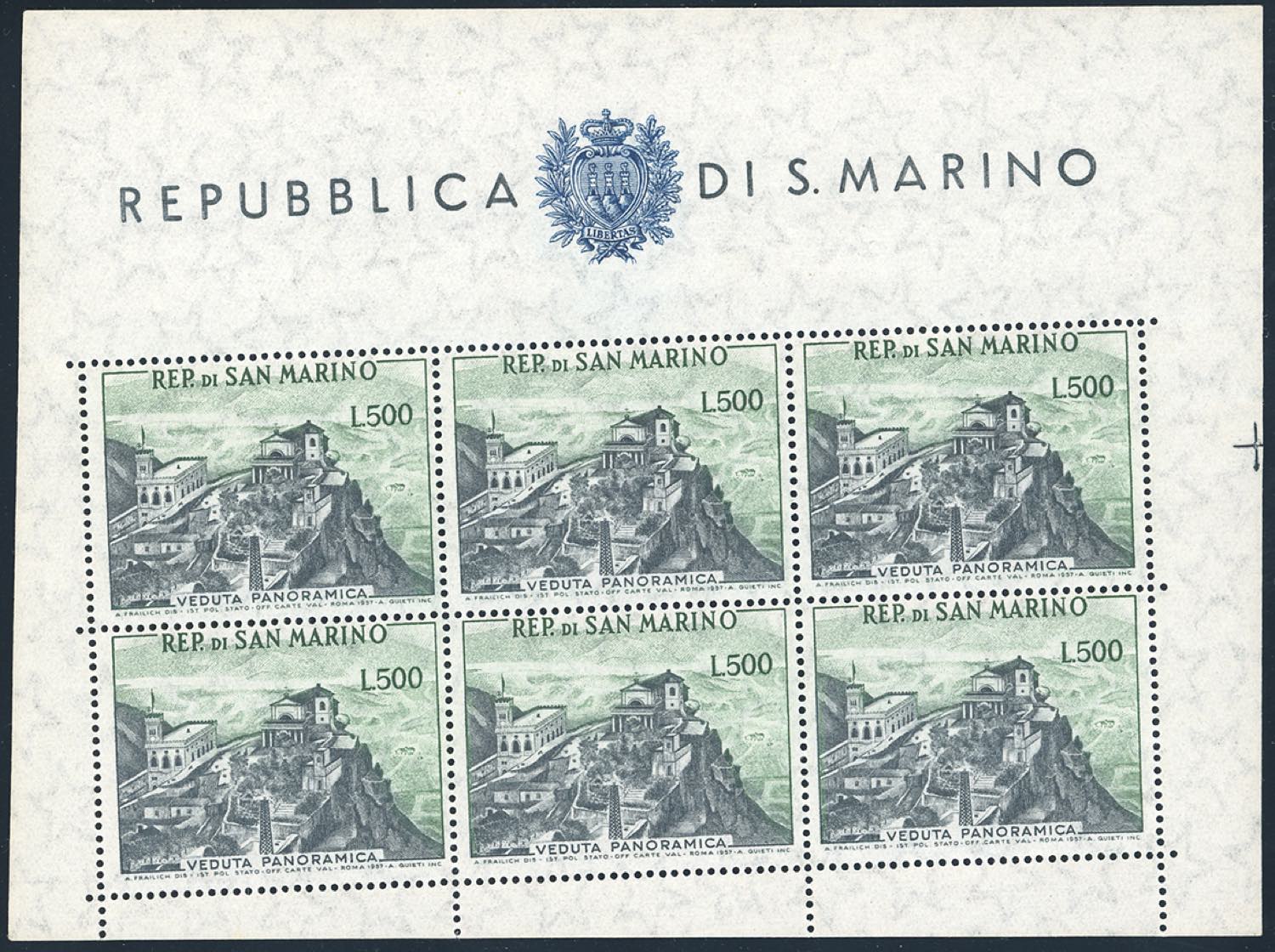 1958 - 500 lire Panorama, foglietto, taglio verticale fortemente spostato a sinistra (18b), gomma originale integra, perfetto. Cert. ... Read more