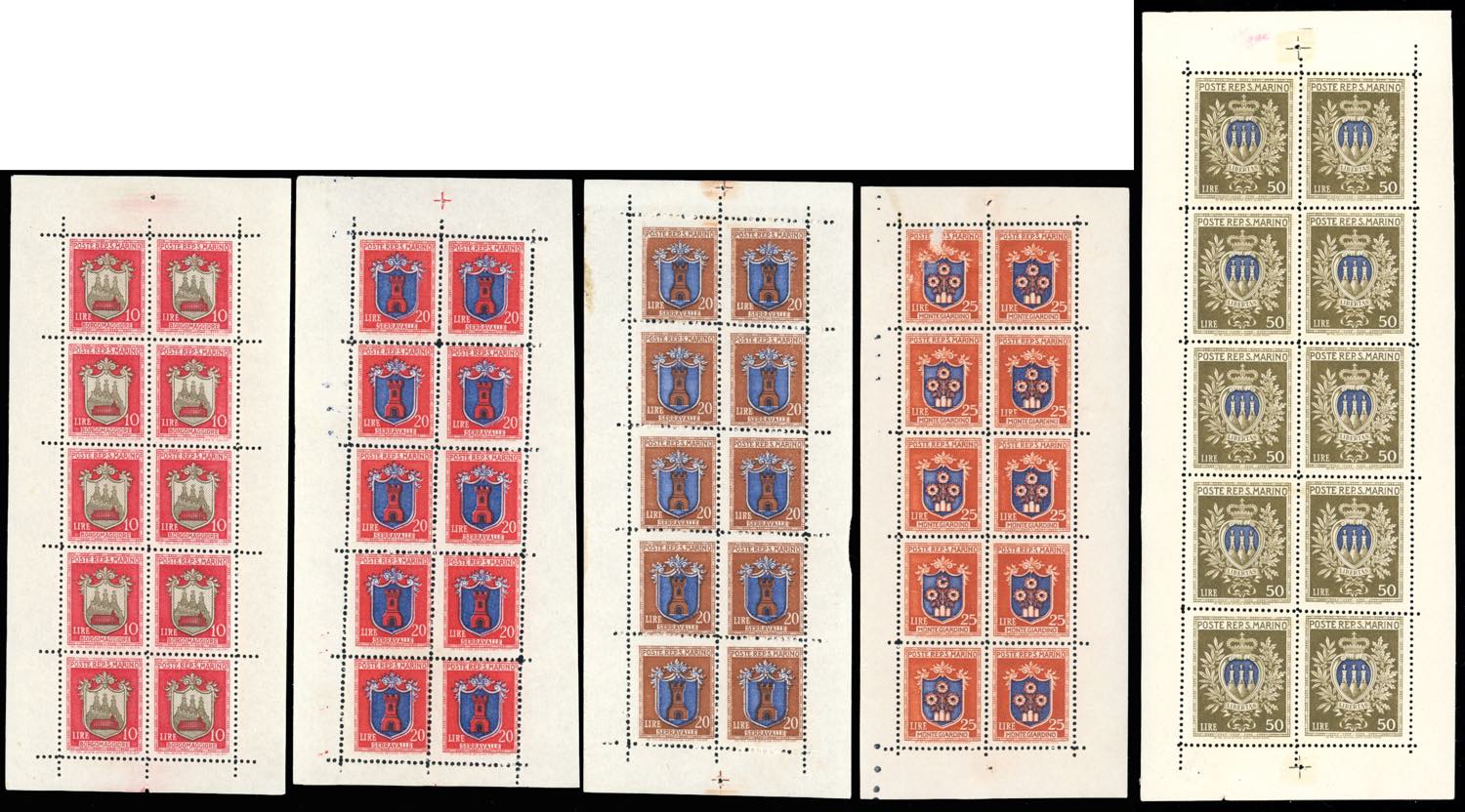 1945/46 - Stemmi, minifogli, serie completa (1/5), gomma originale integra, perfetti ad eccezione di un francobollo da 25 lire che presenta ... Read more