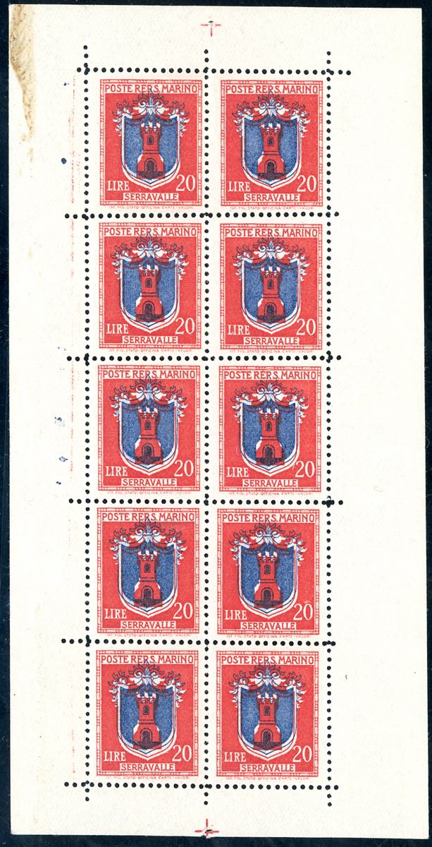 1945 - 20 lire Stemmi, minifoglio, tutti gli esemplari con la stampa dell'azzurro fortemente spostata in alto (2,292ga), gomma originale ... Read more