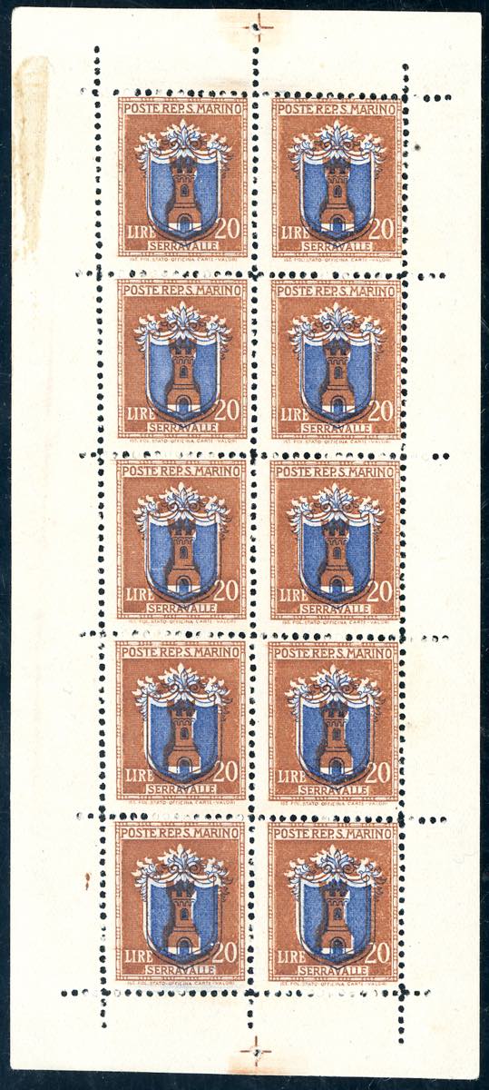 1945 - 20 lire Stemmi, minifoglio, tutti gli esemplari con la stampa dell'azzurro fortemente spostato in basso (3ac), gomma originale ... Read more