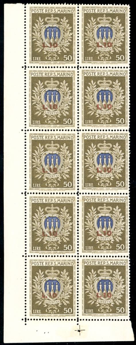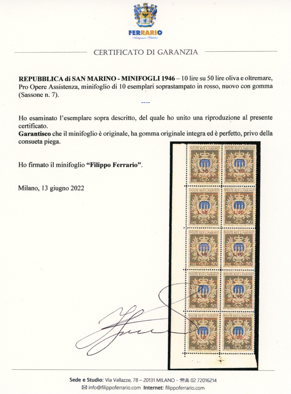 1946 - 10 lire su 50 lire Pro Opere Assistenza, minifoglio (7), gomma originale integra, perfetto. Molto fresco. Cert. Ferrario.