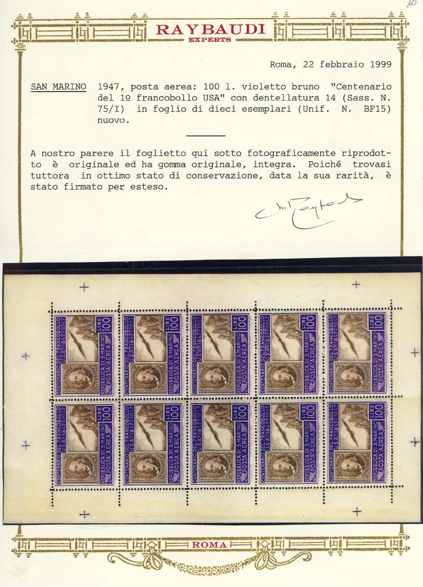 1947 - 100 lire Centenario francobollo americano, minifoglio senza piega (8), gomma originale integra, perfetto. Molto bello. Cert. Zanaria ... Read more