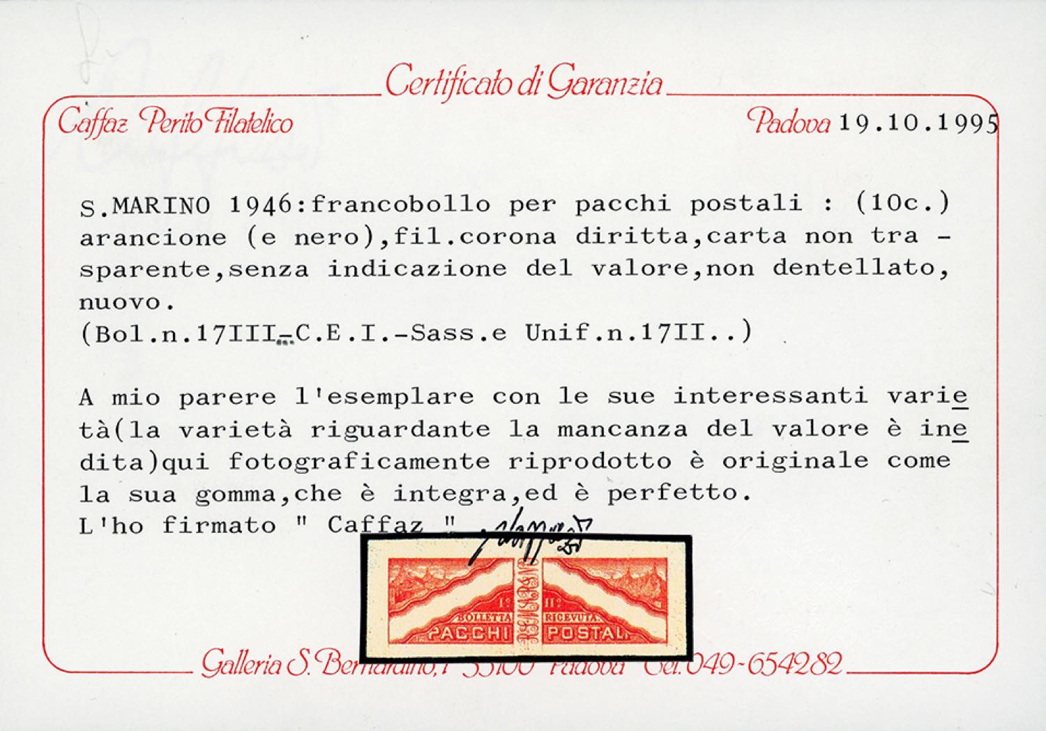 1946 - 10 cent. carta non trasparente, filigrana corona dritta, senza le diciture del valore in entrambe le sezioni (17/IIa), non dentellato, gomma originale integra, perfetto. Varietà molto rara, non catalogato non dentellato. Cert. Caffaz.