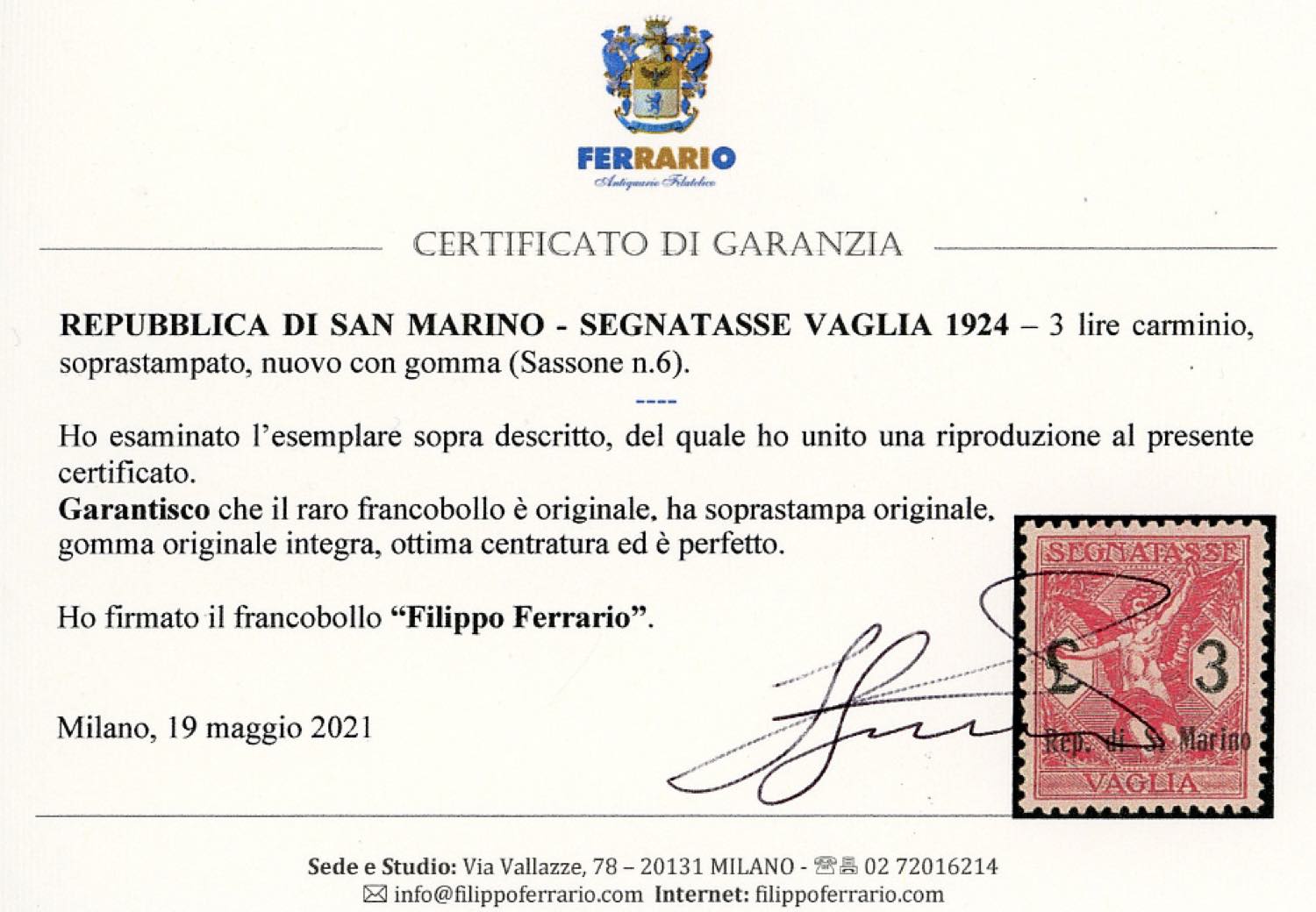 1924 - 3 lire (6), ottima centratura, gomma originale integra, perfetto. Splendido e molto raro di questa qualità. Eccezionale! Cert. ... Read more
