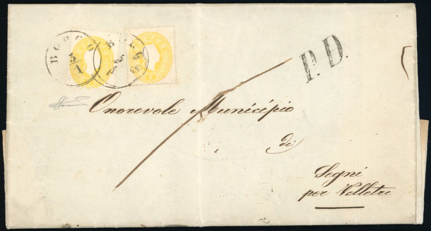 AUSTRIA 1863 - 3 Kr. Giallo (17) due esemplari, perfetti, su circolare a stampa di doppio porto da Borgo 3/1/1863 a Velletri, Stato ... Read more