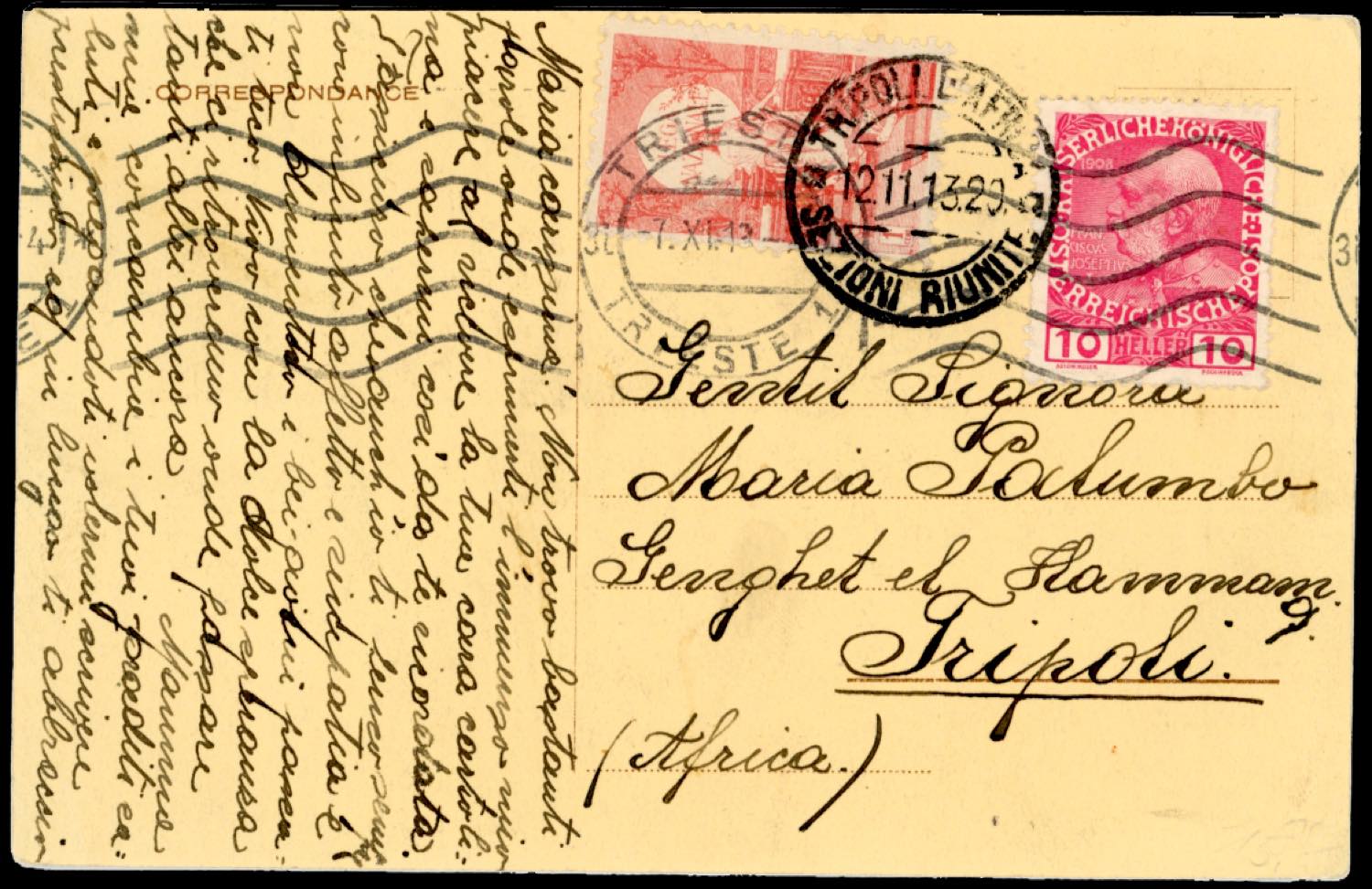 AUSTRIA 1913 - 10 h. Francesco Giuseppe (106), e 10 cent. erinnofilo Lega Nazionale, perfetti, su cartolina da Trieste 7/11/1913 a Tripoli, ... Read more