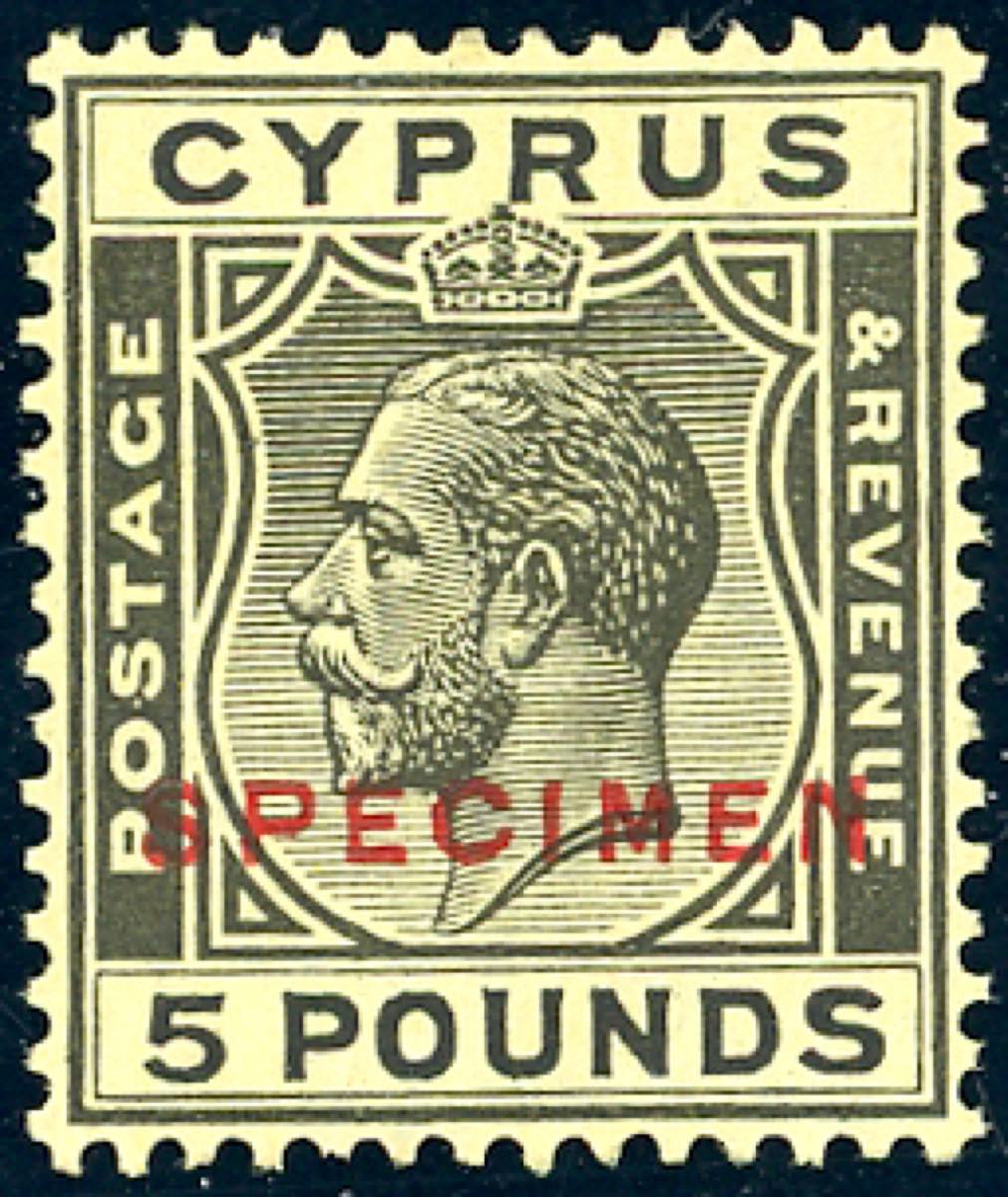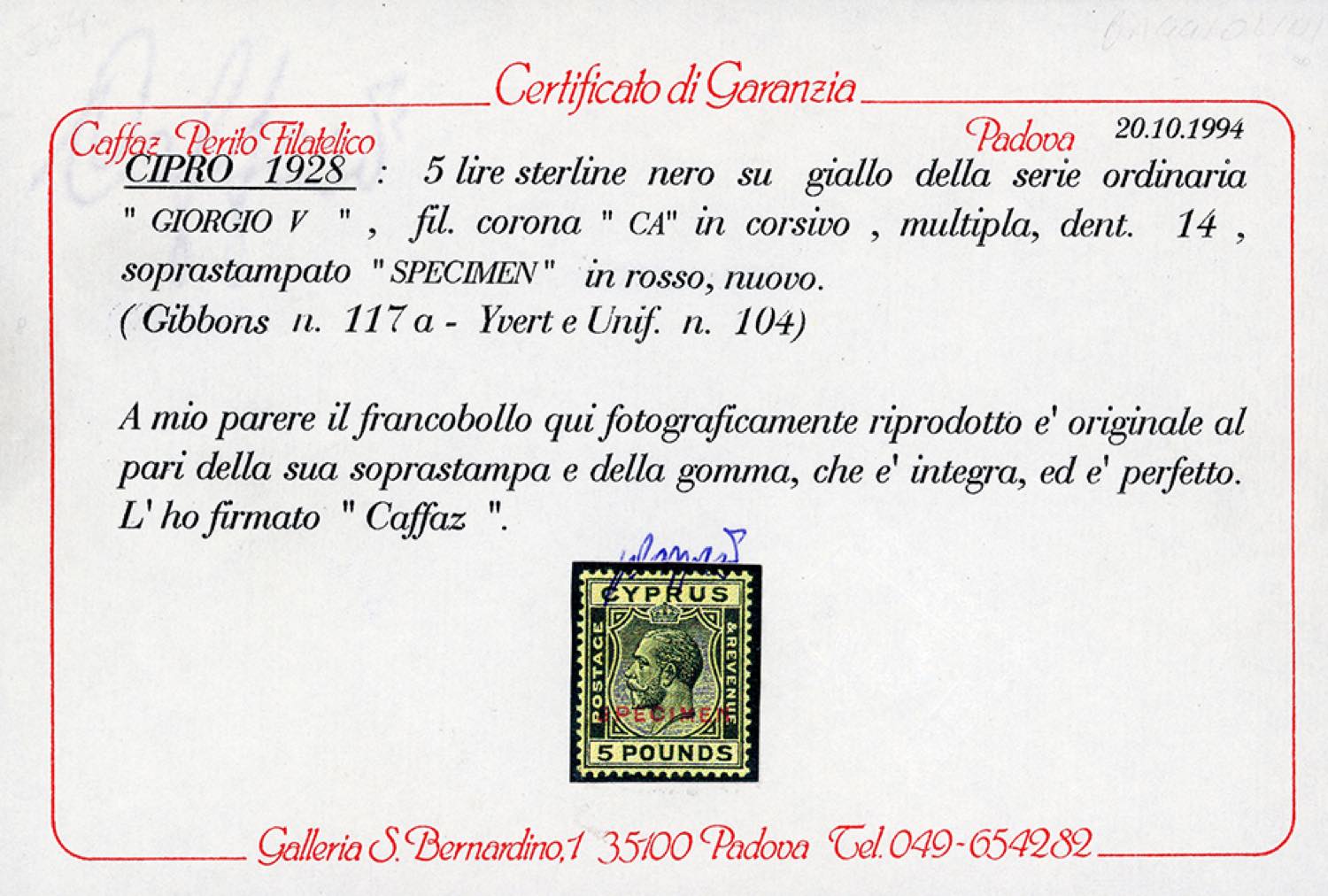 CIPRO 1928 - 5 £ Giorgio V, filigrana corona "CA" in corsivo (Unif. 104, S.G. 117a), soprastampato "specimen" in rosso, gomma originale ... Read more