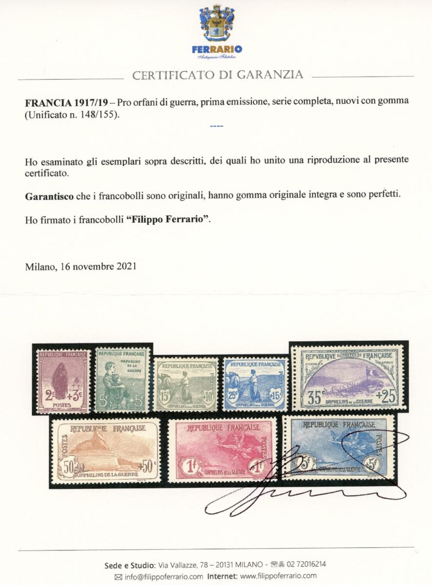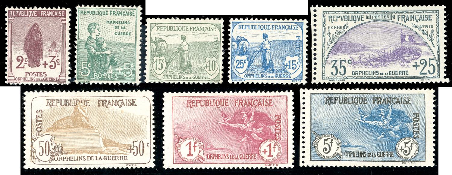 FRANCIA 1917/19 - Pro orfani di guerra, prima emissione, serie completa (148/155), nuovi, gomma originale integra, perfetti. Molto freschi e di ottima qualità. A.Diena e cert. Diena per il 5 franchi, cert. Ferrario per tutti.