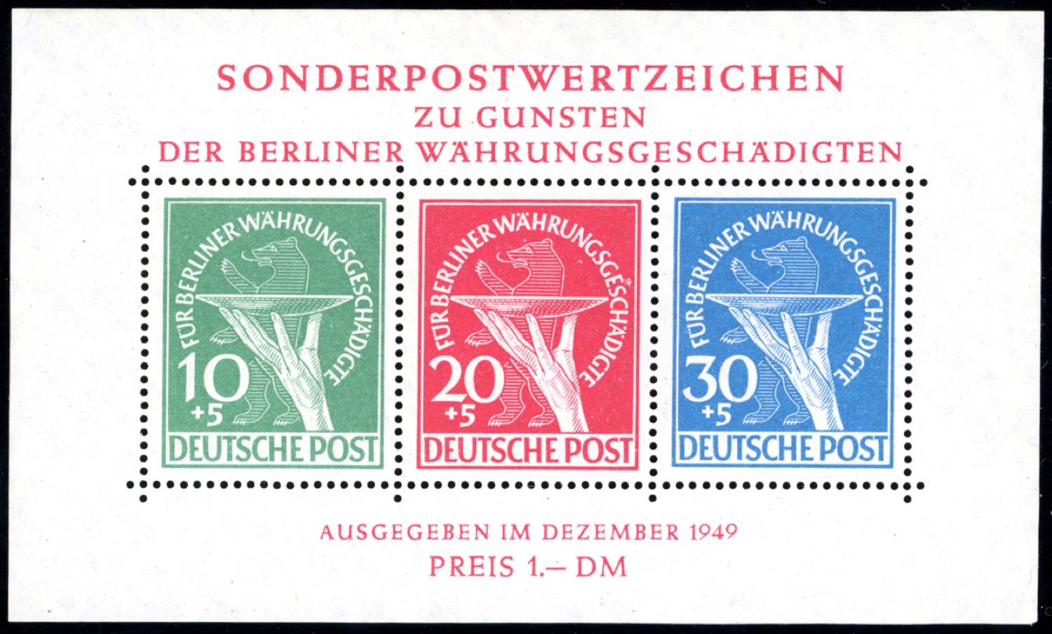 GERMANIA BERLINO FOGLIETTI 1949 - Vittime della riforma monetaria, foglietto (BF1), gomma originale integra, perfetto, MNH.