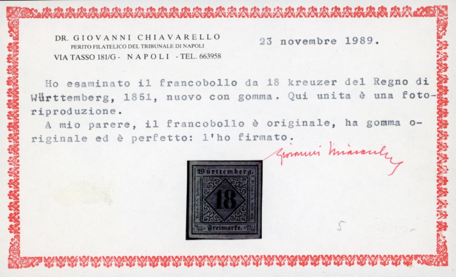 GERMANIA WURTTEMBERG 1851 - 18 Kr. Cifra (5), nuovo, gomma originale, invisibile traccia di linguella, perfetto. Molto bello. Sorani, cert. ... Read more