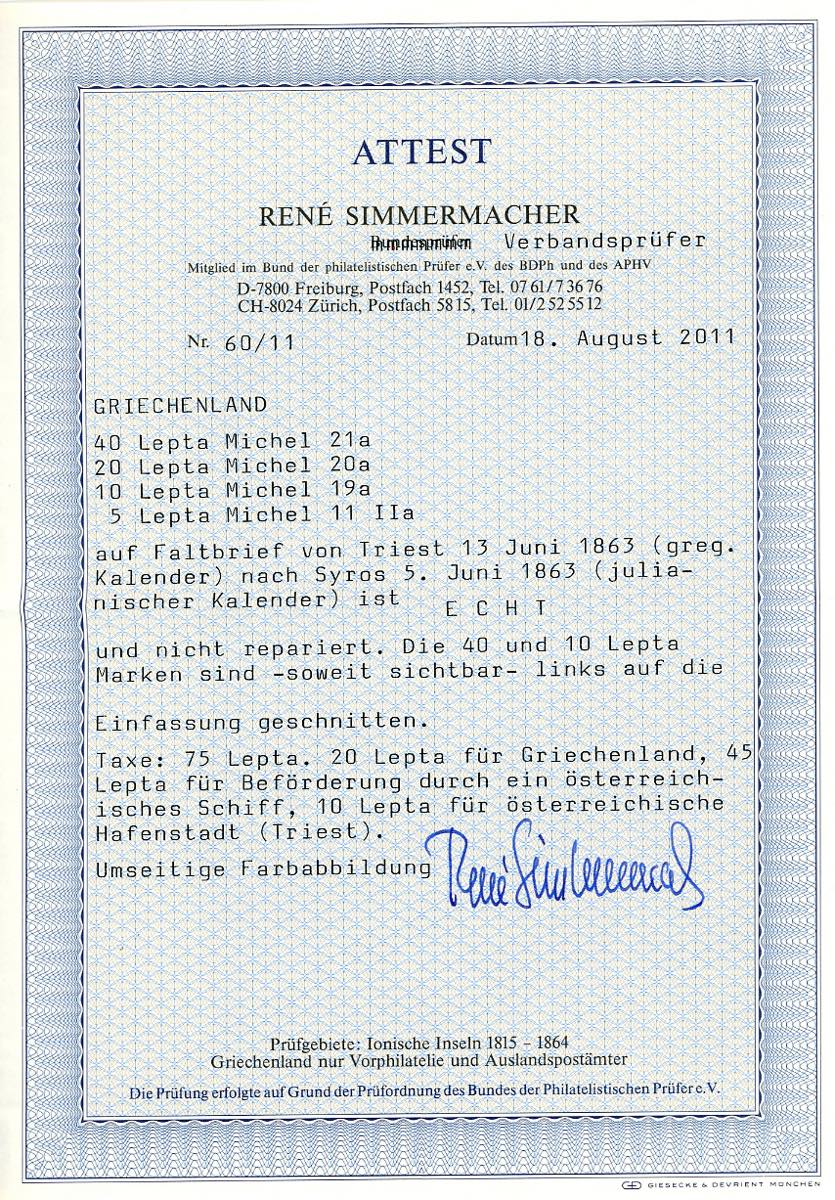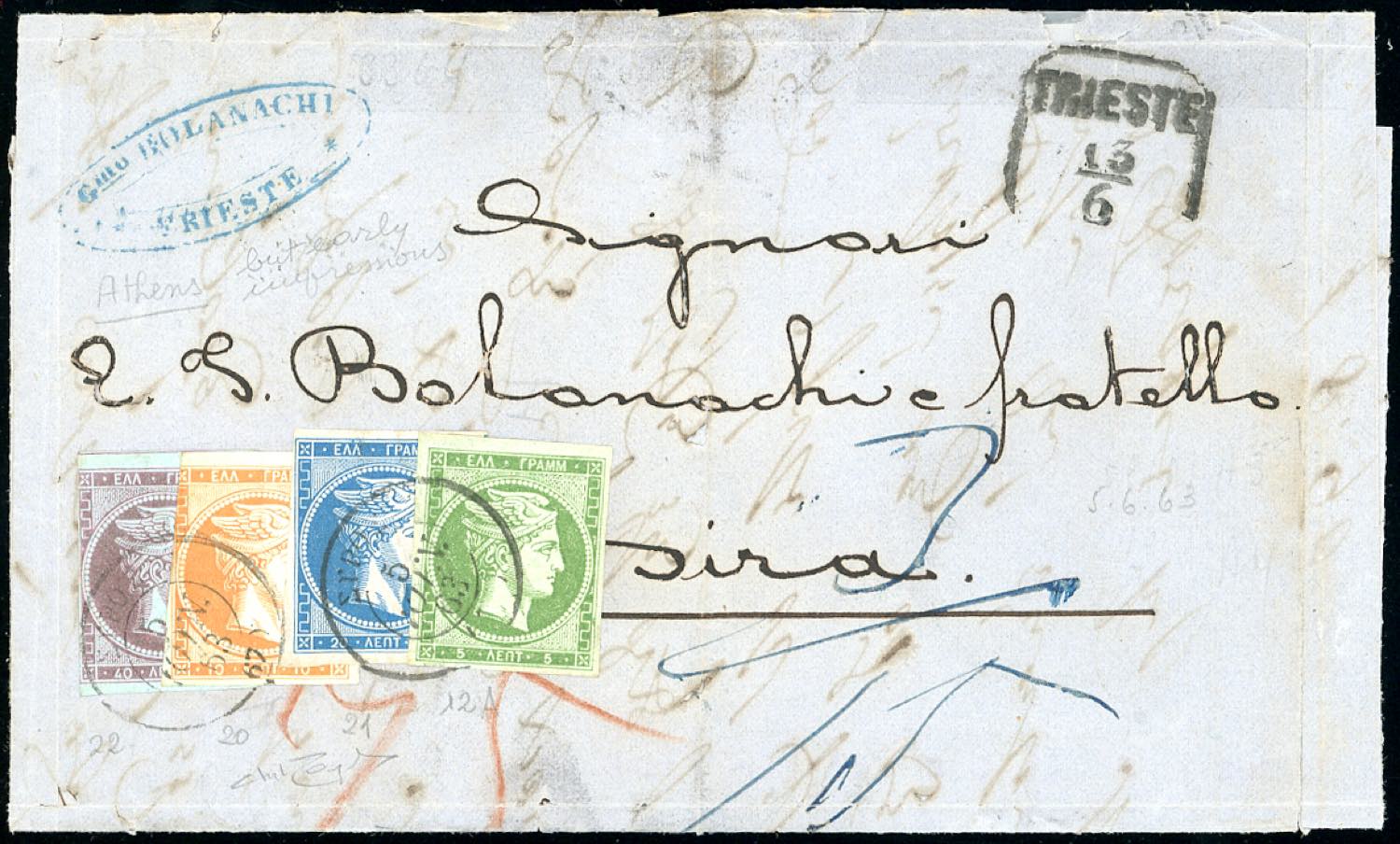 GRECIA 1863 - Lettera non affrancata da Trieste 13/6/1863 a Sira, tassata in arrivo con 5 l., 10 l., 20 l., 40 l. (12A,20,21,22), lievi difetti di marginatura. Bella affrancatura quadricolore. Raybaudi, cert. Simmermacher.