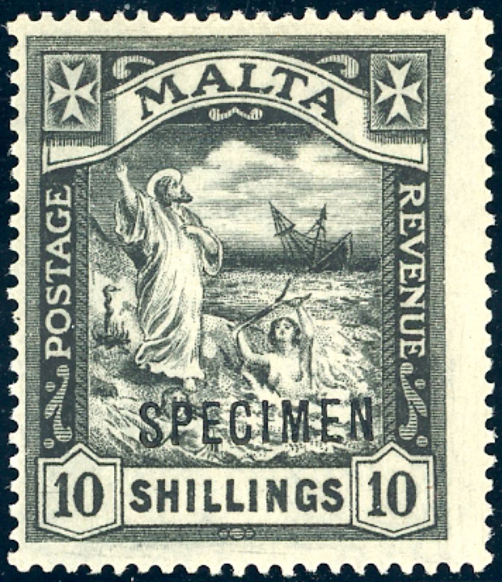 MALTA 1922 - 10 s. Naufragio di S.Paolo (Unif. 53, S.G. 104), soprastampato "specimen" in nero, gomma originale integra MNH, perfetto. ... Read more