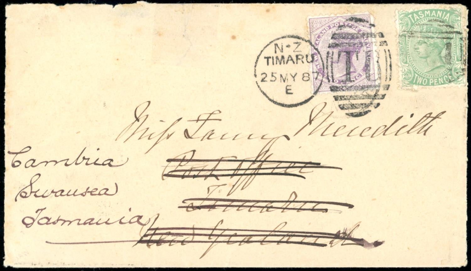 1887 - TASMANIA/NEW ZELAND/TASMANIA - Redirected with additional franking.