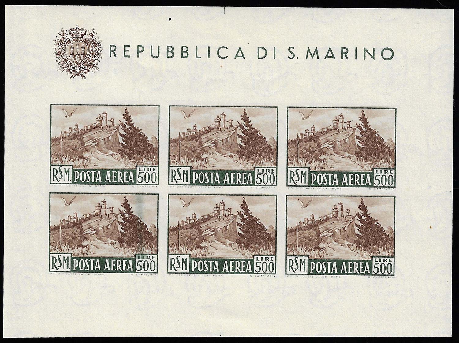 1951 - 500 lire Veduta, posta aerea, foglietto non dentellato (12a), un francobollo con "taglio chirurgico" , gomma originale, perfetto. ... Read more