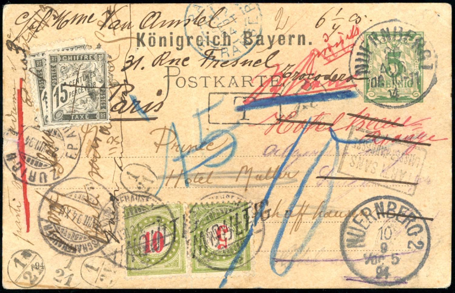 1894 - BAYERN GERMANY/SWISS/FRANCE - Redirected, with postage due. Rare.