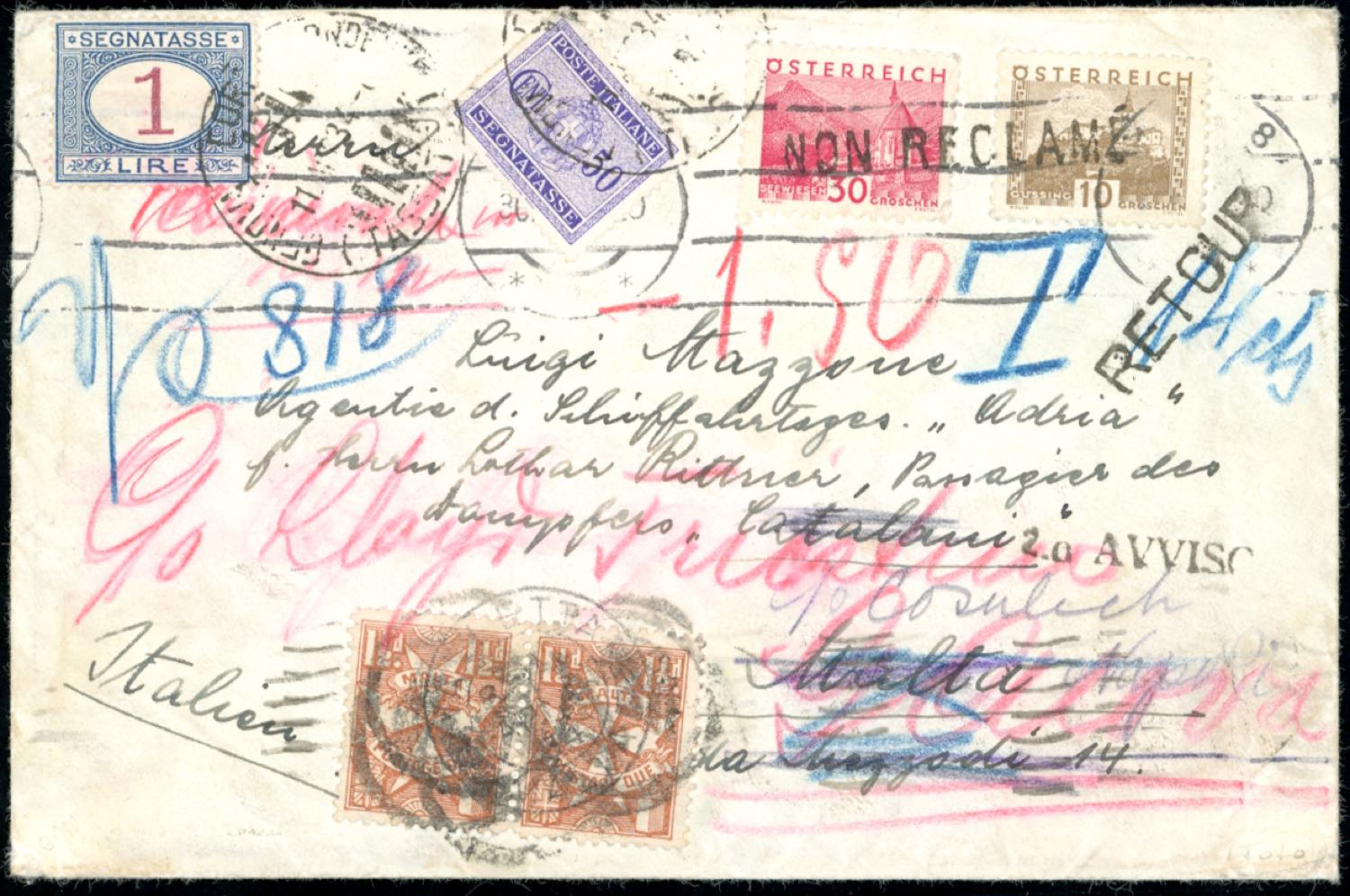 1934 - AUSTRIA/MALTA/ITALY/AUSTRIA - Redirected two times, with postage due. Rare.