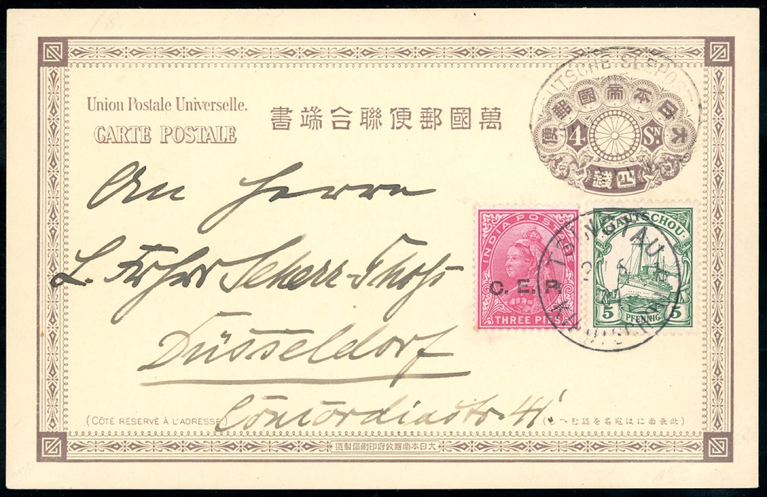 CHINA 1901 - Intero postale di Giappone da 4 sin., integrato con 3 p. India soprastampato "C.E.P." e 5 pf. Kiautshou da Tsingtau 21/6/1901 per la Germania. Non comune.