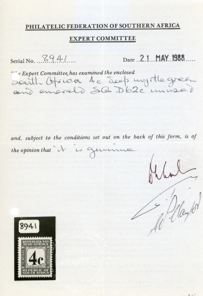 SOUTH AFRICA POSTAGE DUE 1967/71 - 4 cent. deep myrtle green and emerald, wmk w127 upright, type D6 (S.G.62C), mint never hinged, original gum, very fine. Attest of Philatelic Federation of Southern Africa.