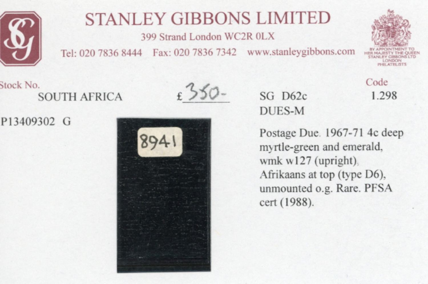 SOUTH AFRICA POSTAGE DUE 1967/71 - 4 cent. deep myrtle green and emerald, wmk w127 upright, type D6 (S.G.62C), mint never hinged, original ... Read more
