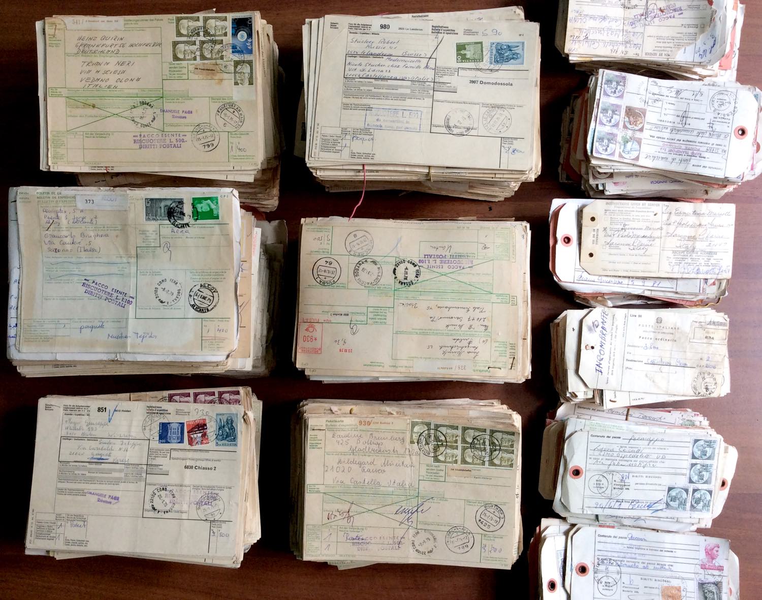 REPUBBLICA ITALIANA 1970/1990 - Scatolone contenente una importante accumulazione di bollettini pacchi italiani ed esteri, con valori italiani, sia pacchi postali, dimezzati ed interi, sia ordinari. Ottimo per studio e dettaglio.