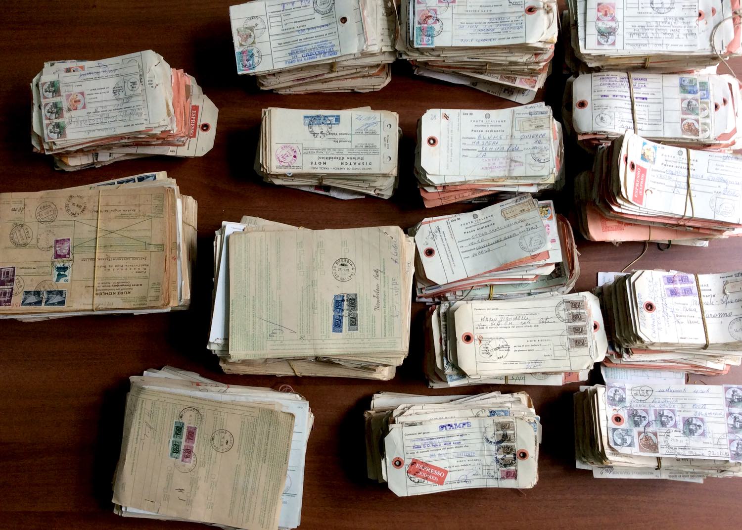 REPUBBLICA ITALIANA 1970/1990 - Scatolone contenente un'enorme accumulazione di bollettini pacchi italiani ed esteri con valori italiani, sia pacchi postali, dimezzati ed interi, sia ordinari. Ottimo per studio e dettaglio.