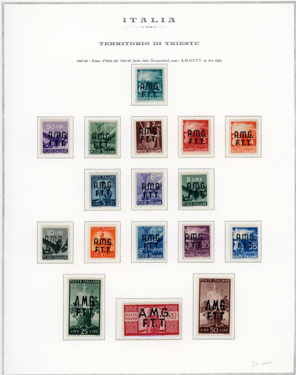 TRIESTE A AMG-FTT 1947/1954 - Collezione praticamente completa di francobolli e servizi del periodo (mancano solo i segnatasse n.5/15), montata in fogli d'aggiornamento Marini. Ottima qualità.