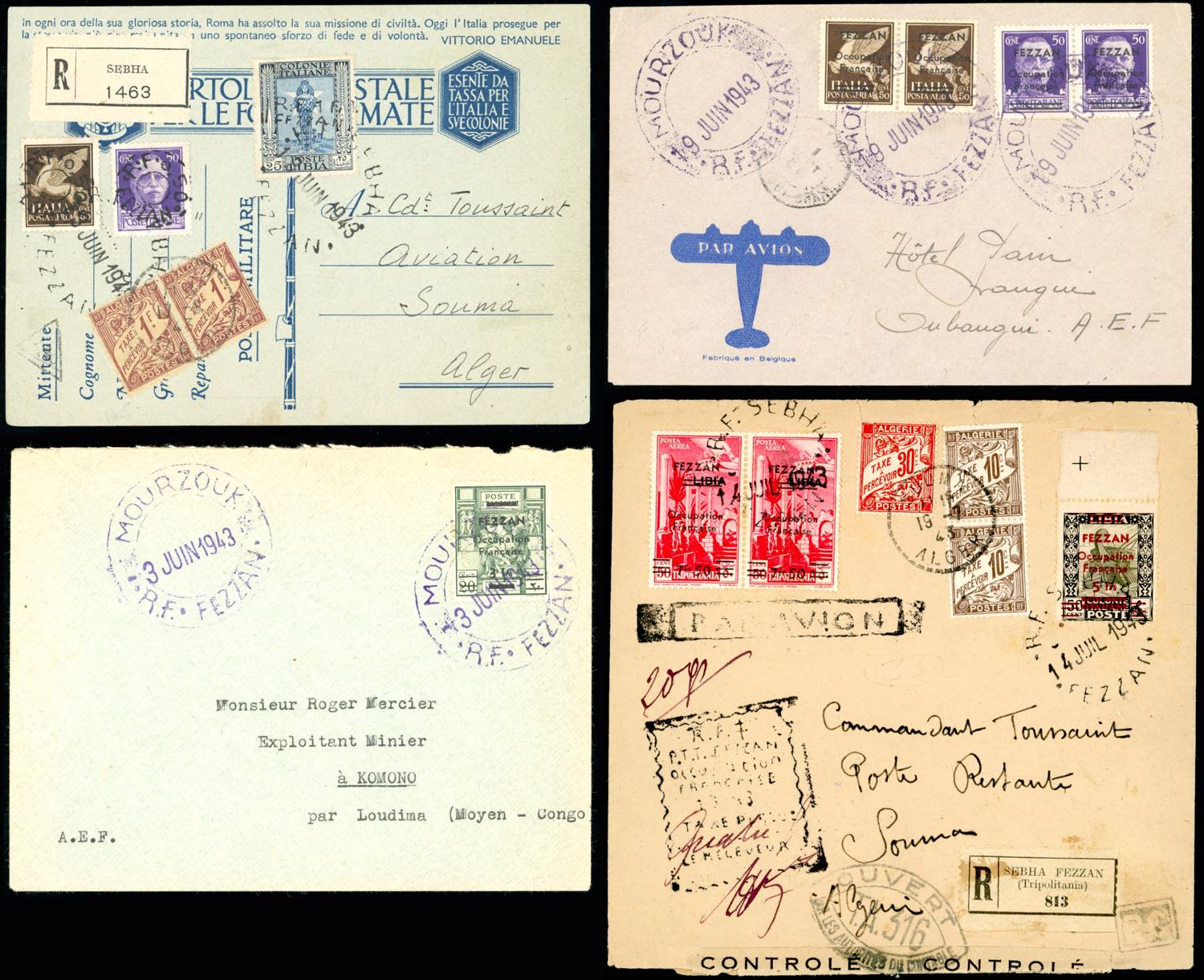 COLONIE ITALIANE OCCUPAZIONE FRANCESE FEZZAN 1943 - Quattro lettere con rare ed importanti affrancature dei valori soprastampati, di ottima qualità. Insieme molto raro, per specialista.
